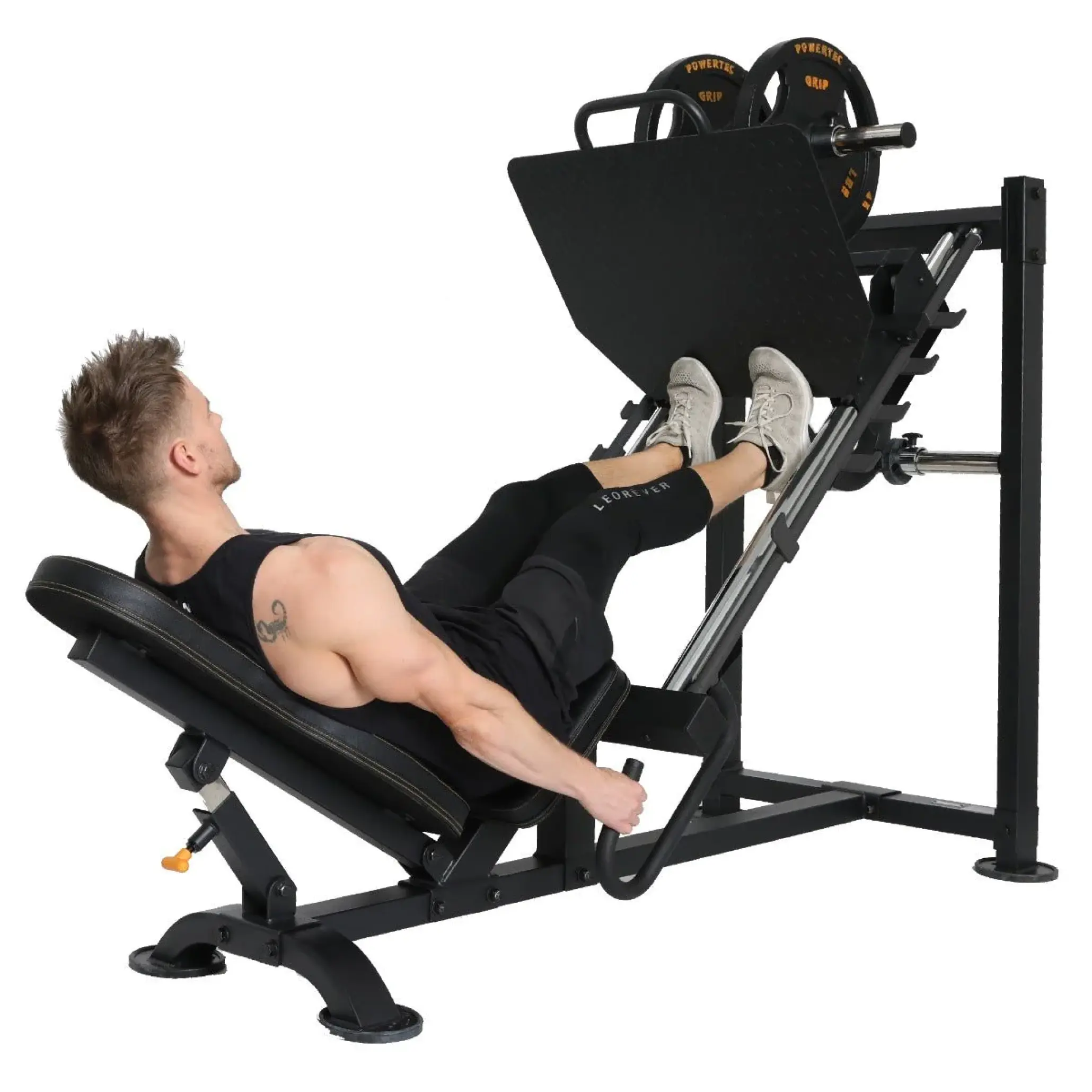 The Leg Press comes with dual safety catches, a large foot plate, and an adjustable backrest for different leg press positions.