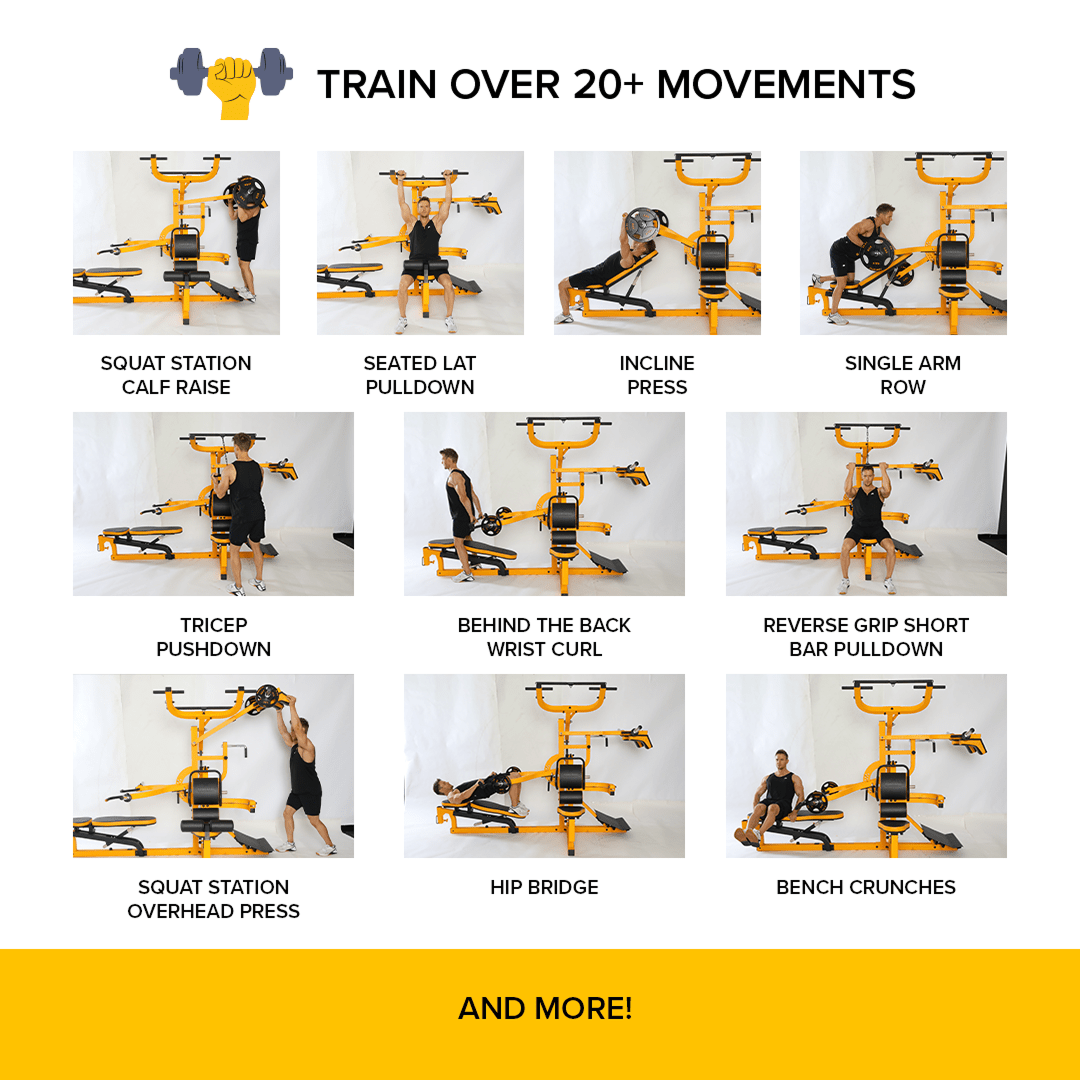 Max Weight Capacity: Press station: 500 lbs., Lat Station: 300 lbs., Squat Station: 500 lbs.